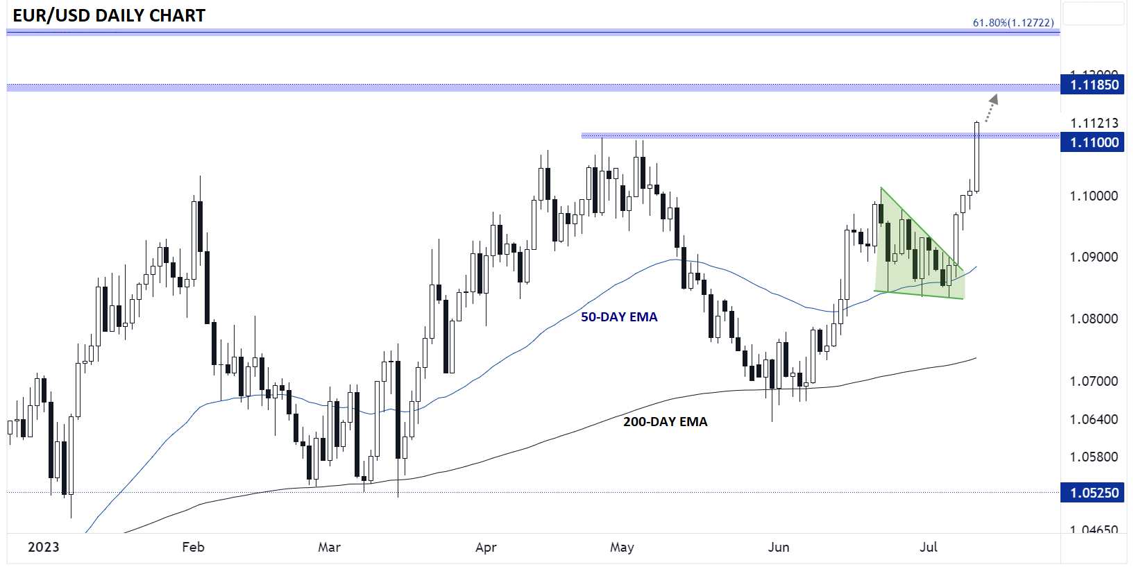 果不其然,美元是当天表现最弱的主要货币对,但欧元/美元的走势尤其引人注目。我们发稿时,世界上交易量最大的货币对正飙升超过100点,突破1.1100,创下16个月来的最高点位!